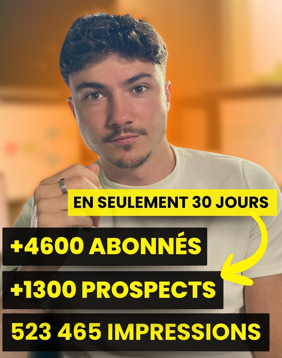 Un total de 523 465 impressions, 1300 prospects qualifiés, +4000 abonnés et des dizaines de ventes en en 30 jours. Avant le système ContinuumLead, Hugo m'a dit : "Si on a un prospect, je suis content". 30 jours plus tard, on a explosé ses attentes et il est devenu numéro 1 de son secteur.