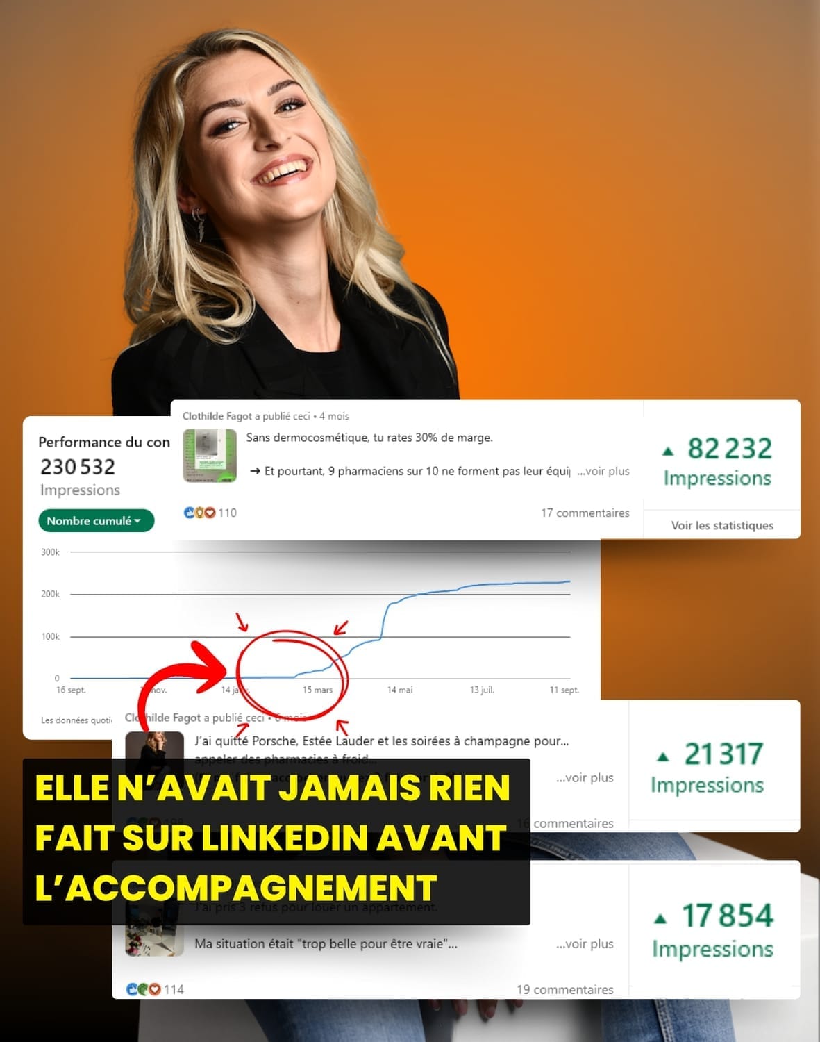 Elle n'avait rien sur LinkedIn et est devenue une référence de son secteur niche grâce à des publications allant jusqu'à +80 000 vues. Elle reçoit aujourd'hui régulièrement des demandes de formations sur LinkedIn et est reconnue par ses pairs.